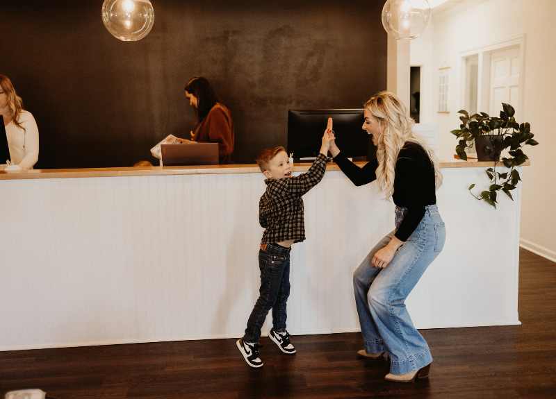 Dr Lauren gives a kid a high five after his chiropractic adjustment